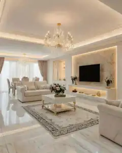 الأسقف سواء كانت عادية أو من جبس بورد، يُفضل دهانها باللون المطفي (مات) وعادة ما يكون أبيضًا أو أوف-وايت. هذا الاختيار يمنع انعكاسات الإضاءة المزعجة ويخفي أي شقوق بسيطة في التشطيب. اعتمد على الإضاءة الجيدة لجعل سقفك يبرز بشكل أنيق دون الحاجة لألوان زاهية. فالأسقف البسيطة البيضاء مع إضاءة مخفية مثلاً، تعطي مظهرًا راقيًا وتمنح الغرفة عمقًا أكبر دون عناء.